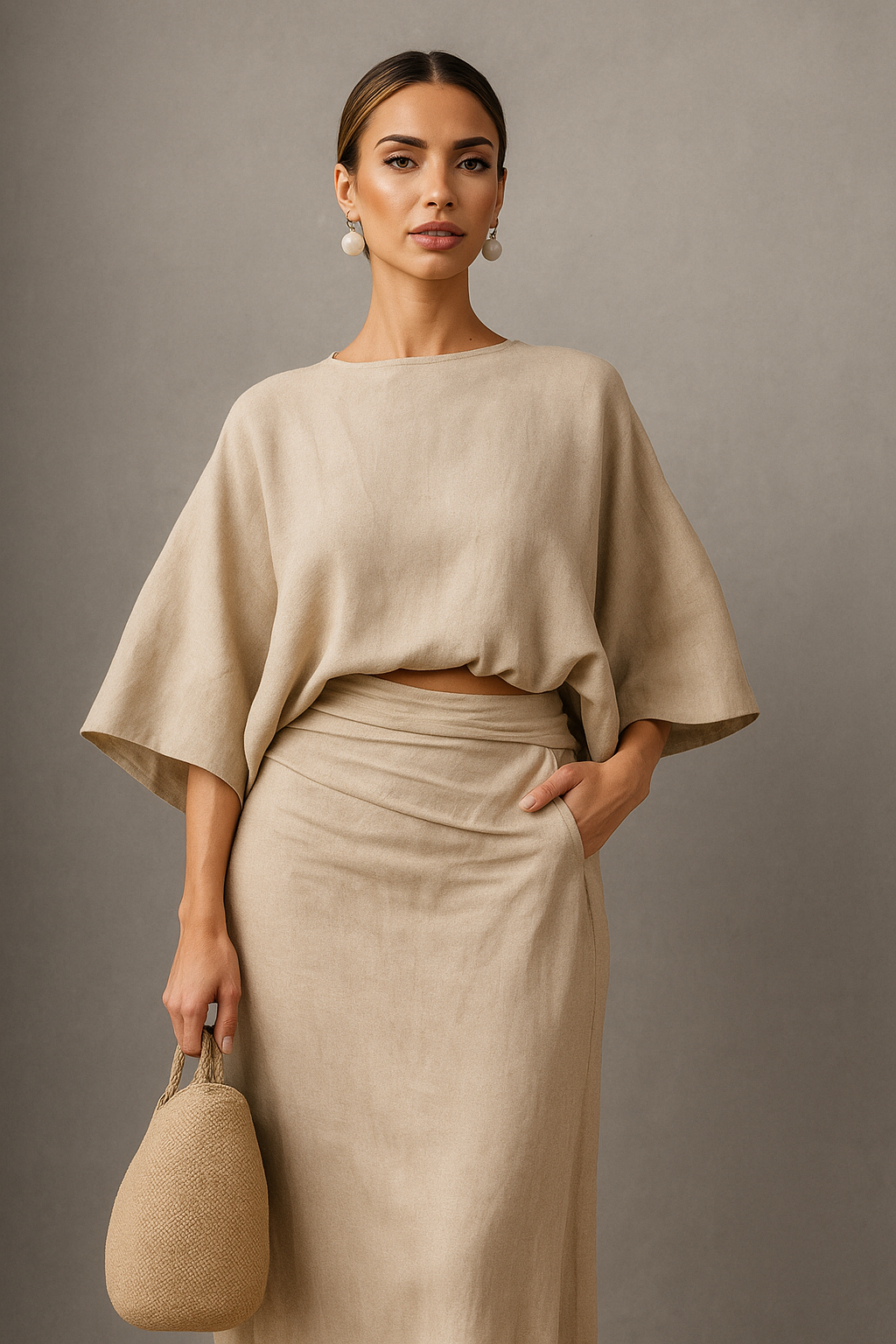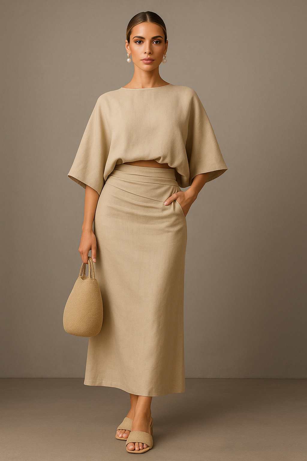 Este elegante conjunto de dos piezas color caqui, presenta una mezcla transpirable de algodón y lino con un moderno top con mangas y una falda larga y fluida. El ajuste holgado y cómodo combina moda y facilidad, ideal para ocasiones casuales y semiformales.